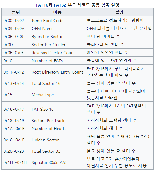 FAT32 부트 레코더다. 보면 0x1fe에는 시그니처가 들어가야된다고 나와있다.