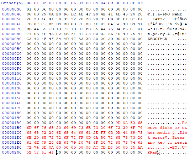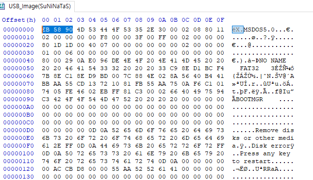 이렇게 시그니처와 아래의 FAT32를 보고, FAT32(EB 58 90)인 것을 알 수 있다.