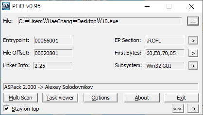 ASPack으로 패킹이 된 것을 볼 수 있다.