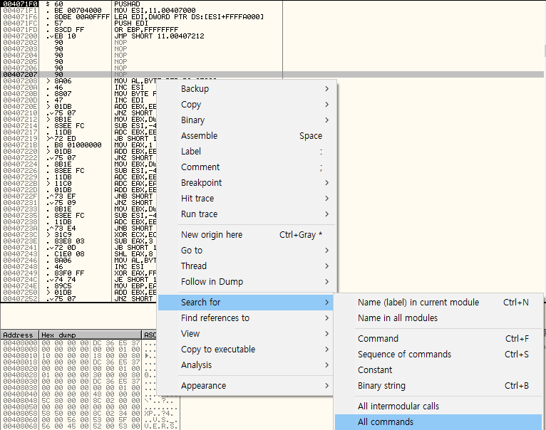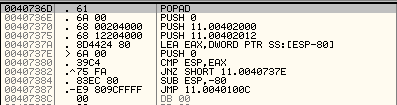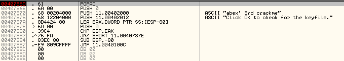 0040736E~00407370까지 stolenbyte인 것을 알 수 있고, OEP는 jmp문으로 점프하는 부분일 것이다.