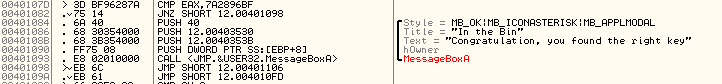 이 부분이 진짜 문자열과 비교하여 체크하는 부분이고, 7A2896BF와 비교하여 같을경우 성공메세지가 출력된다.