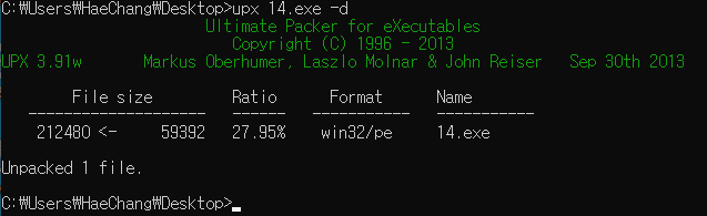 UPX로 패킹이 된 것을 확인할 수 있었고, 툴을 통해 언패킹을 진행했다.