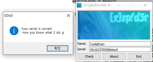 성공메세지로 가는 점프문위로 BP를 걸고, CodeEngn/1을 넣고 인증해봤다.