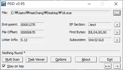 압축을 풀고 실행시키기 전에 PEID로 열어보았다.