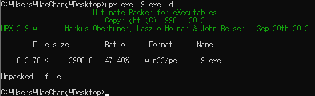 UPX로 패킹된 것을 볼 수 있고, 언패킹툴을 통해 언패킹을 진행했다.