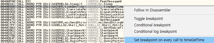 시간과 관련된 함수인 것을 볼 수 있었고, timeGetTime 함수 모두에 BP를 걸었다.