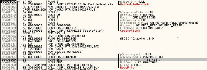 보게되면, CreateFile을 통해 CRACKME3.KEY이 있는 경우에 18바이트만큼 문자를 읽는 것을 볼 수 있었습니다.