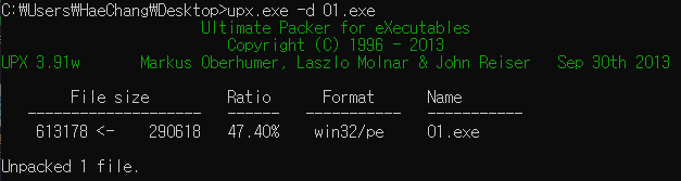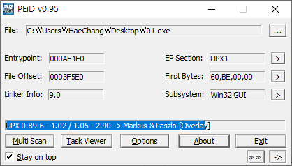 UPX로 패킹된 것을 볼 수 있었고, 언패킹을 진행했다.