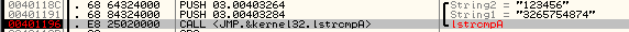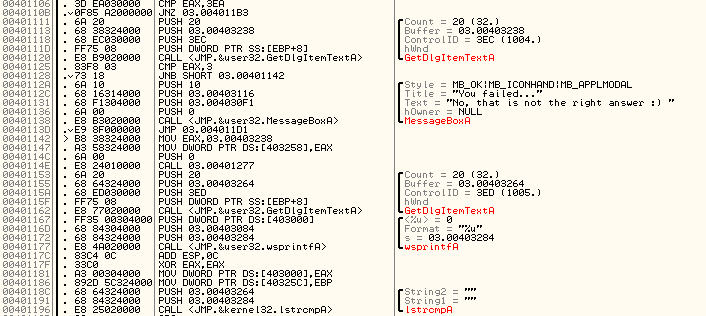 위의 GetDigItemTextA 함수는 네임과 관련된 함수이고, 메세지박스는 틀렸을 경우 출력하는 메세지이고, 아래 GetDigItemTextA는 시리얼과 관련된 함수이다. 그 후에 IstrcmpA를 통해 네임과 시리얼을 비교하는 것이다.