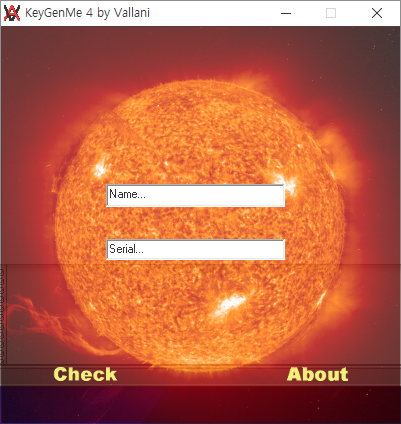 위와같은 화면이 출력되고, 이름과 시리얼을 입력하고 체크를 눌러 인증하는 프로그램으로 추측된다.