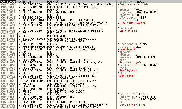 401006으로 점프하는 반복문의 끝에 BP를 걸고 F9를 눌러 실행 후 401006으로 이동했다.