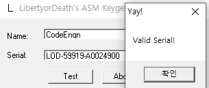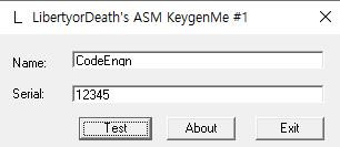 Name에 CodeEngn, Serial에 무작위로 12345를 넣고, Test를 눌렀다.
