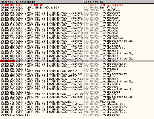 비주얼 베이직 프로그램의 문자열 비교 함수인 __vbaStrCmp를 찾았고, 해당 부분에 BP를 걸고 실행시켜봤다.