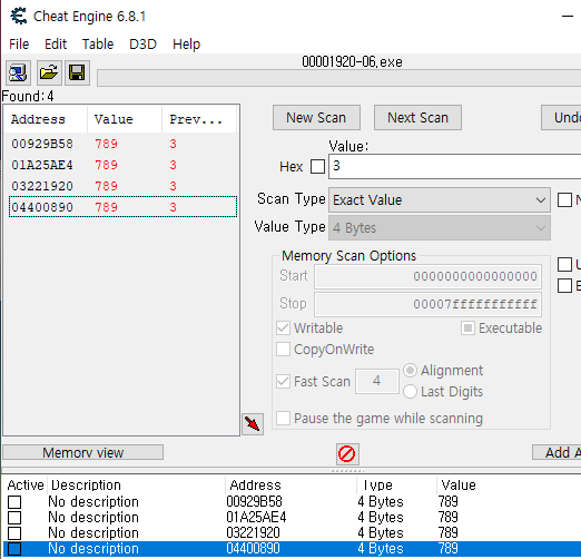 스캔을 통해 4까지 진행하여 4개의 값을 추출했고, 벨류를 모두 789으로 변경 후 확인을 눌러보도록 하겠다.