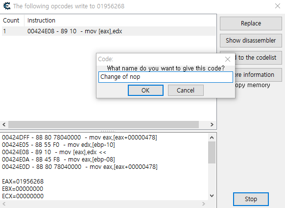 값이 바뀌는 부분을 NOP했기 때문에 값이 바뀌지 않고, Next가 활성화 되는 것을 볼 수 있다.