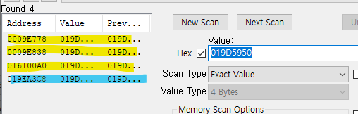 * 내 컴퓨터의 경우에는 노란색을 access address 후 Change Value를 진행하면 프로세스가 멈추는 현상이 있어