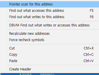 주소목록에서 해당되는 주소를 한번 클릭 후 오른쪽 마우스로 pointer scan for this address를 누른다.
