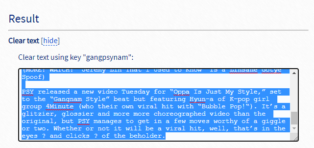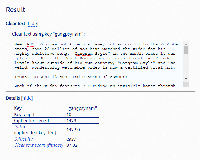이런식으로 Cipher Text에 암호화된 문장을 넣고, Break Cipher을 누르면 복호화가 된다.