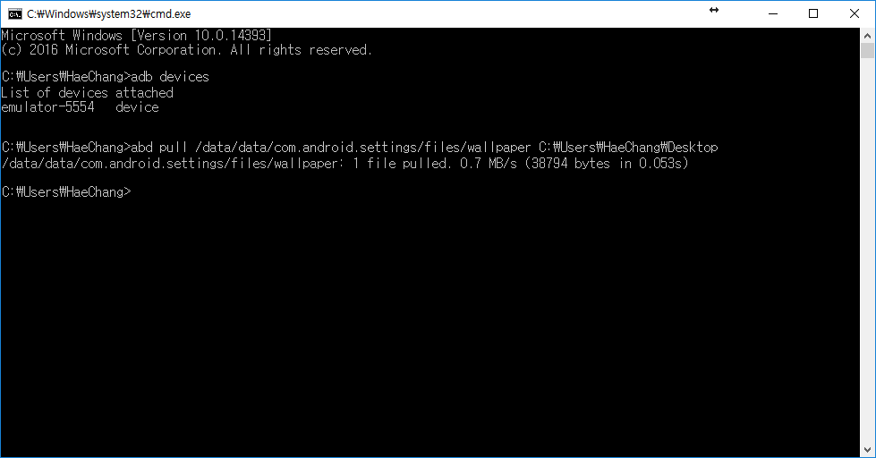 abd pull /data/data/com.android.settings/files/wallpaper 추출할 경로 를 입력해주면 바탕화면이 추출되는 것을 볼 수 있다.