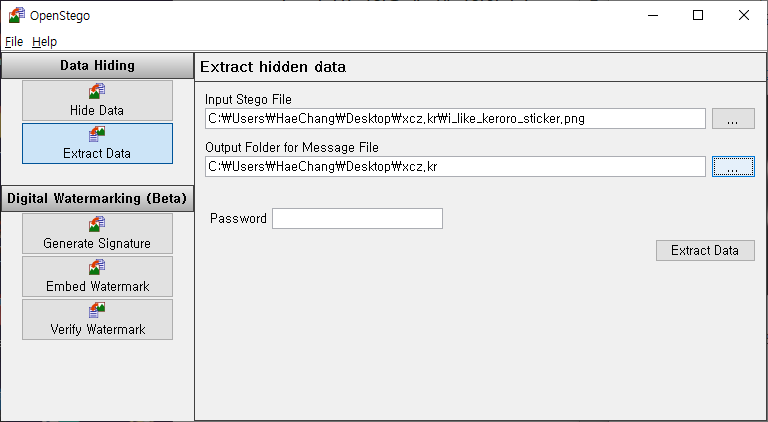 추출을 위해 Stego file에 케로로 사진을 넣고, Output 폴더를 지정해줬다.