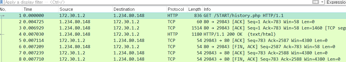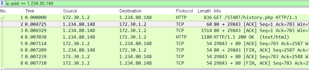 이렇게 윗 부분에 필터를 적는 부분에 ip.addr == 1.234.80.148을 적으면 1.234.80.148와 관련있는 패킷들만 필터링이 된다.