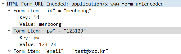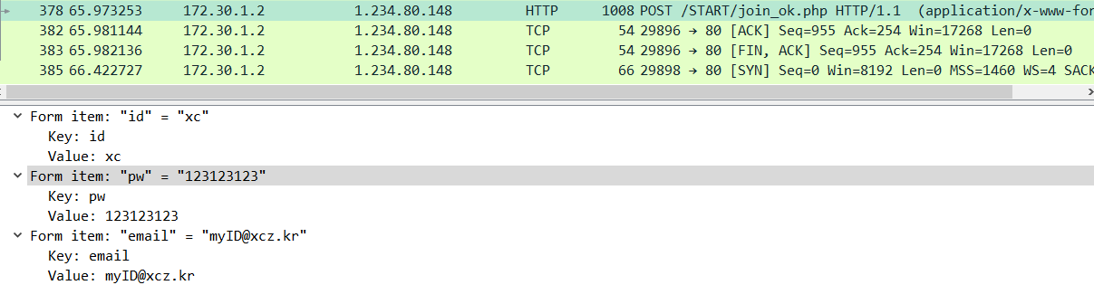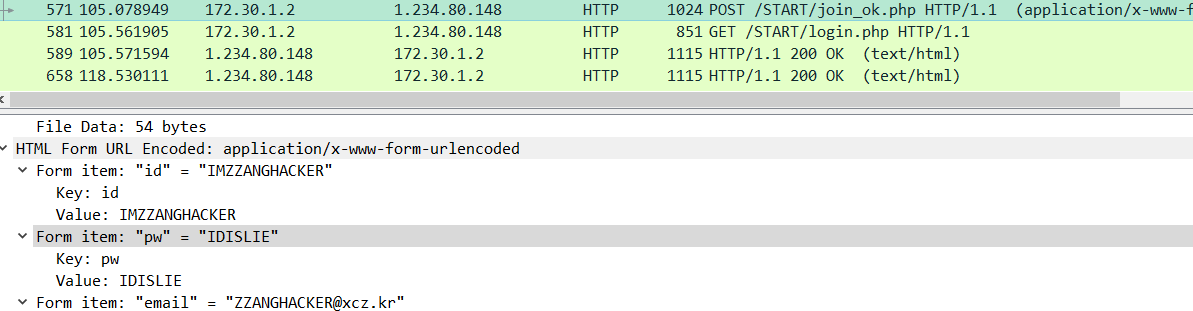 이렇게 필터를 ip.addr == 1.234.80.148 && http contains "join_ok.php" 라고 적용하여 패킷 갯수를 줄였다.