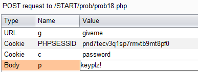 따라서 get으로는 giveme , cookie로는 password , post로는 keyplz! 를 넘기면 문제가 풀릴 것이라고 생각했고,