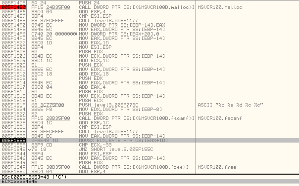 BP를 걸고 한줄씩 실행하다가 DS 에 C라는 문자열이 담긴 것을 볼 수 있었고, 아래 덤프창에 00bc1365주소로 가보도록 하겠다.
