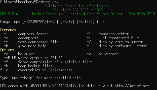 upx.exe를 cmd를 통해 실행해야만 한다.