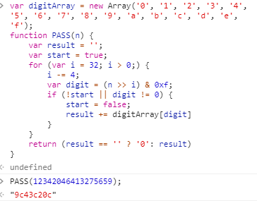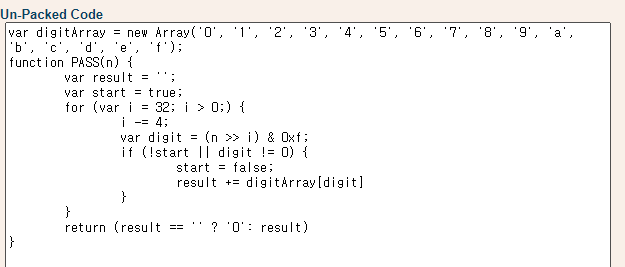 eval(function(p,a,c,k,e,r){e=function(c){return c.toString(a)};if(!''.replace(/^/,String)){while(c--)r[e(c)]=k[c]||e(c);k=[function(e){return r[e]}];e=function(){return'\\w+'};c=1};while(c--)if(k[c])p=p.replace(new RegExp('\\b'+e(c)+'\\b','g'),k[c]);return p}('g l=m o(\'0\',\'1\',\'2\',\'3\',\'4\',\'5\',\'6\',\'7\',\'8\',\'9\',\'a\',\'b\',\'c\',\'d\',\'e\',\'f\');p q(n){g h=\'\';g j=r;s(g i=t;i>0;){i-=4;g k=(n>>i)&u;v(!j||k!=0){j=w;h+=l[k]}}x(h==\'\'?\'0\':h)}',34,34,'||||||||||||||||var|result||start|digit|digitArray|new||Array|function|PASS|true|for|32|0xf|if|false|return'.split('|'),0,{}))