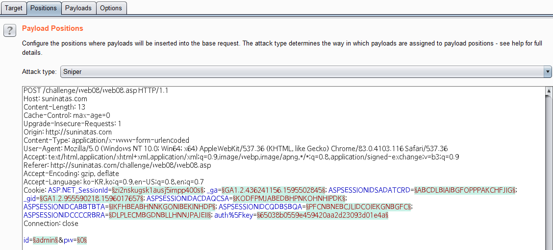 포지션을 보면 이렇게 §표시로 우리가 페이로드를 설정할 수 있다.