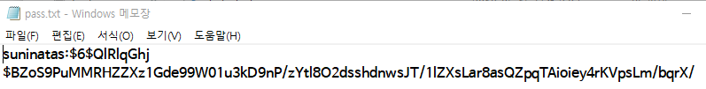 우선 pass.txt라는 파일에 suninatas유저 필드를 붙여넣도록 하겠다.