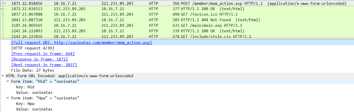 내리다보면 mem_action으로 post요청을 보내는 패킷을 또 발견할 수 있다.