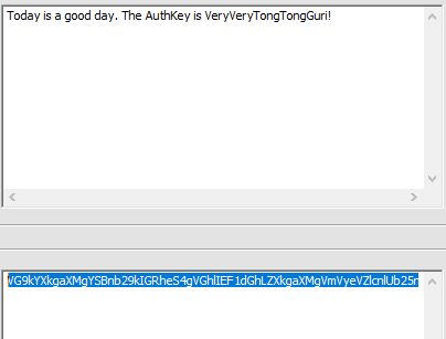 이렇게 위의 숫자들을 아스키에 해당하는 문자로 바꾸면 VG9kYXkgaXMgYSBnb29kIGRheS4gVGhlIEF1dGhLZXkgaXMgVmVyeVZlcnlUb25nVG9uZ0d1cmkh
