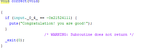 즉 input의 첫 4바이트 값이 -0x21524111(0xdeadbeef)과 같아야 클리어되는 것을 알 수 있다.