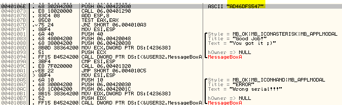 OEP는 00401360인 것을 볼 수 있었고, 스트링 검색을 통해 시리얼 값을 알 수 있었다.