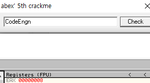 BP에 걸려 해당주소까지만 실행이 되고, 실행창이 뜨면 CodeEngn을 적고 체크를 누른다.