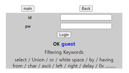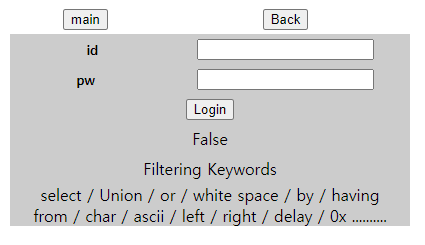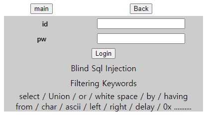 * Blind SQL Injection : SQL인젝션과 동일하지만, 오류가 출력되지 않을 때 사용할 수 있는 기법이다. 한 문자씩 추출해서 DB의 정보를 알아낼 수 있는 특징이 있다.