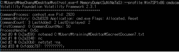 cmdscan이라는 옵션을 통해 무엇을 cmd에 입력했는지 보도록 하겠다.