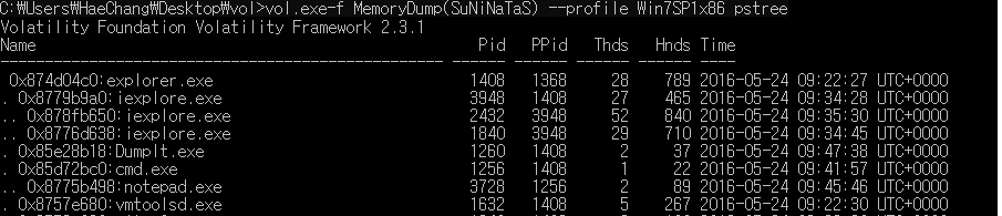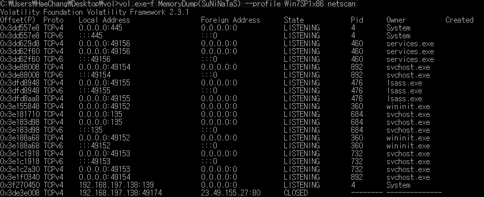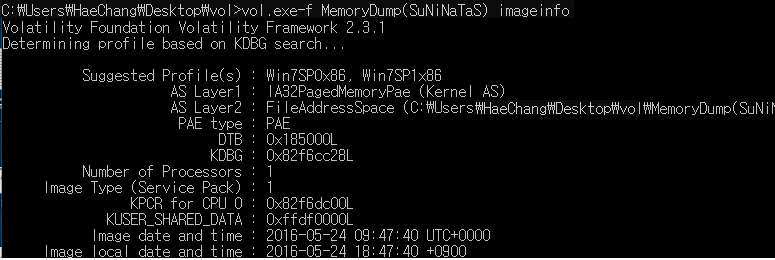 vol.py -f 파일명 imageinfo 이라는 명령어를 통해 해당 덤프 파일의 시스템 정보를 알 수 있다.